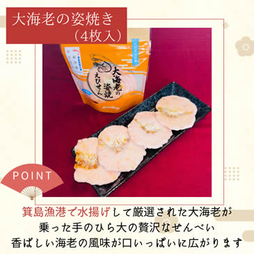 30年以上もの間、売れ続けている食べ応えのある海老の姿焼きです。特殊製法により馬鈴薯澱粉をアルファ化、ほかのえびせんにはない自然の甘味。甘味料は一切使用していません。口の中に入れた瞬間海老の香ばしい香りが口の中に広がり生地のあまみがあとから追いかけてきます。 この商品は10年程前にNHKのちょっといい旅で取材されたときにTV出演し放送されて紹介されたえびせんべいです。